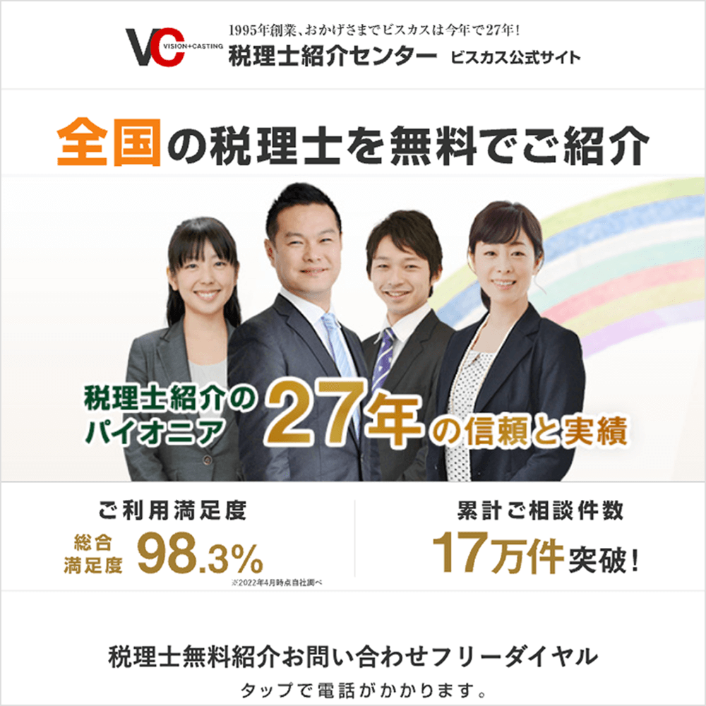 | 紹介税理士の選定方法 | 個人・法人様の実際の声や口コミ、社内ミーティングにより 、特徴・得意分野・相性などを含めて比較して、お客様に最適な税理士を選定 |